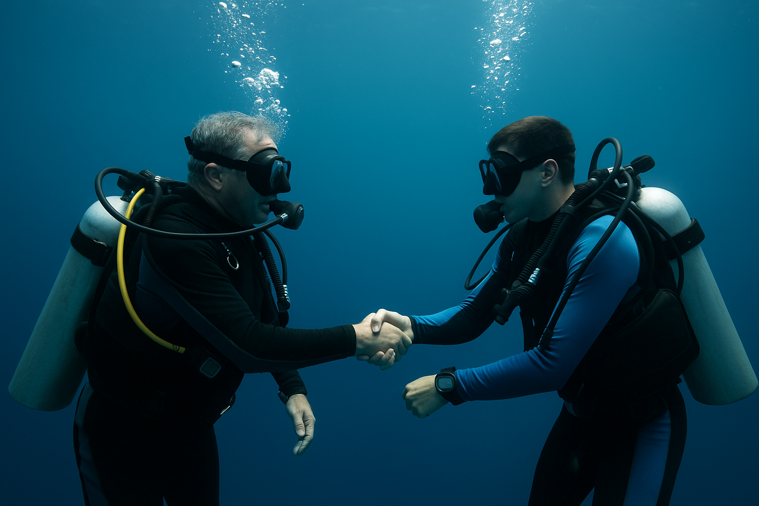 La relación entre compañeros de buceo se basa en la comunicación, la confianza y el respeto mutuo. Antes de entrar al agua, ambos revisan juntos el equipo, los planes de buceo y las señales de emergencia. Este trabajo en pareja no solo refuerza la seguridad, sino que también mejora la experiencia al compartir objetivos y responsabilidades.